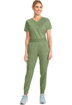 This Modern Classic fit mid rise pull-on jogger has an encased elastic knit waistband with interior drawstring. There are five pockets: two front patch pockets, a double cargo pocket with a bungee ID badge loop, and one back patch pocket. The pant also features a tapered leg and knit cuffs. Leg opening: 9 1/2". Inseam: 28 1/2"