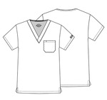 A Unisex V-neck top features Dickies logo twill tape at the back neck, a front chest pocket with a bar tacked pencil slot and side vents.